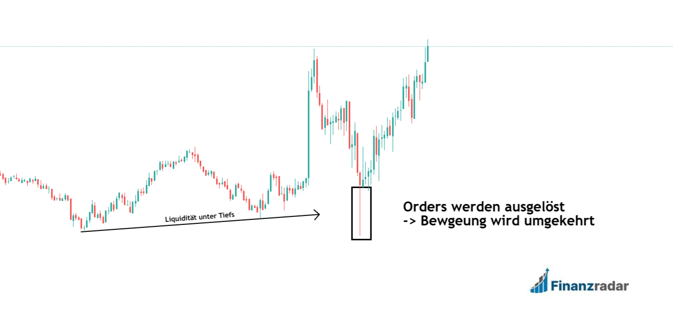 Die Liquidität beschreibt die Fähigkeit des Marktes, Käufe und Verkäufe ohne wesentliche Preisänderungen durchzuführen. Die ist dort besonders hoch, wo Käufer und Verkäufer Limit Orders setzen, da diese automatisch ausgeführt werden. Laut Huddleston nutzt Smart Money das Konzept der Liquidität gezielt aus, um zum Beispiel mittels ”False Breakouts” falsche Fährten zu legen. Banken nutzen die Liquidität, um ihre Orders in den Markt zu bekommen.