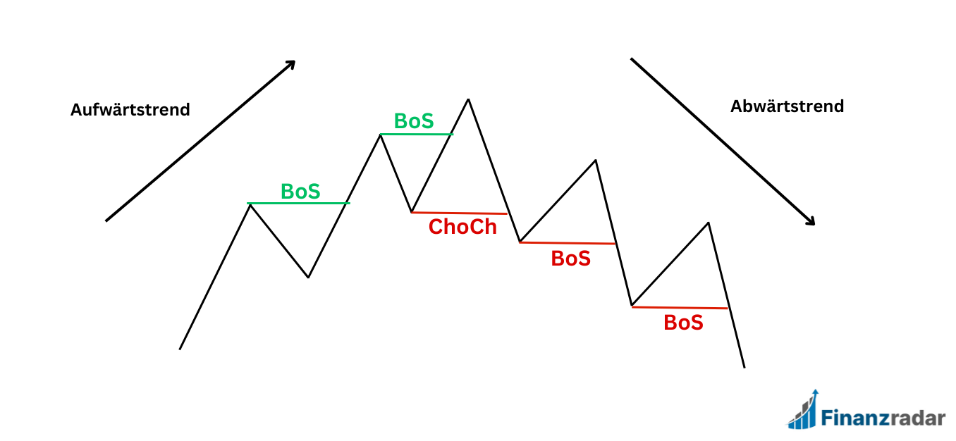 Mit der Struktur des Marktes meint das ICT Trading die Kursbewegungen, mit Hauptaugenmerk auf die Hochs und Tiefs und wie diese sich zueinander verhalten. Aufwärtstrends sind durch die bekannte Definition ”höhere Hochs und höhere Tiefs”, Abwärtstrends durch ”tiefere Tiefs und tiefere Hochs” gekennzeichnet.