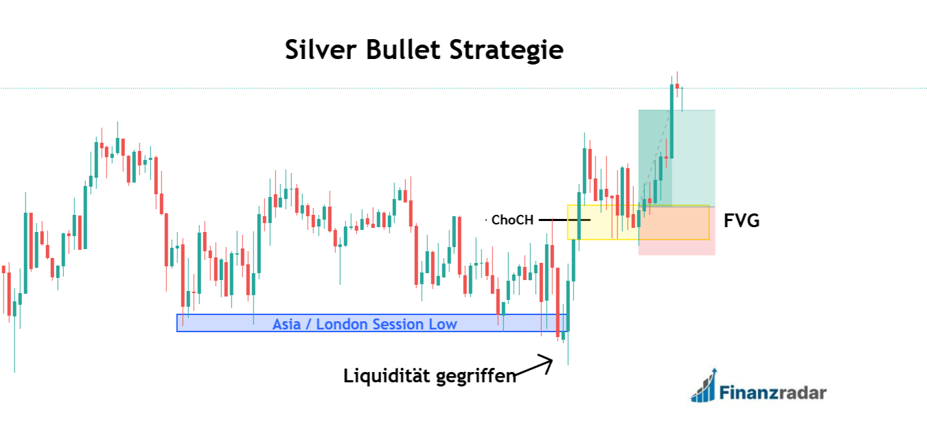 Die Silver Bullet Strategie nutzt die vorgestellten Konzepte, um schnelle Gewinnmitnahmen zu realisieren. Du identifizierst die Preisniveaus, wie ich sie Dir im Konzept ”Liquidität” vorgestellt habe, erkennst Verschiebungen und Marktineffizienzen und findest so den passenden Einstiegspunkt, um eine Position zu eröffnen.