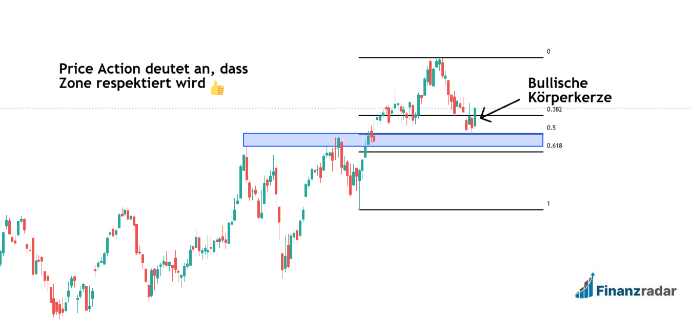 Natürlich schaue ich mir ganz genau an, wie die Price Action bzw. die Candlesticks in dieser Konfluenzzone aussehen, wenn der Kurs da reinläuft. Dochte und Lunten sowie die Stärke der Kerzenkörper sind weitere mögliche Signalgeber. Insbesondere bärische oder bullische Formationen und abnehmendes Momentum weisen oft auf eine bevorstehende Trendumkehr hin, die ja in einem solchen Konfluenzbereich wahrscheinlich ist.