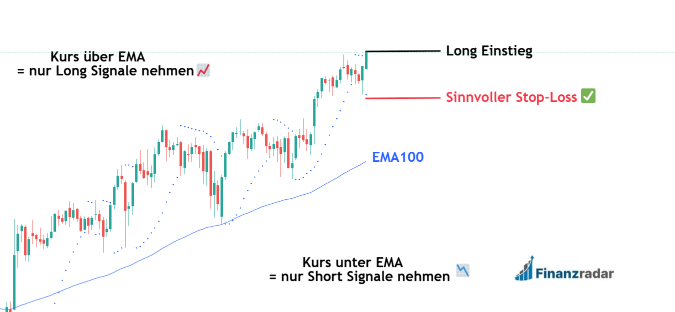 Eine gute Strategie für Anfänger ist das Trend Trading mittels 2 Indikatoren. Der EMA100 soll die Trendrichtung filtern, während der Parabolic SAR das finale Signal gibt. Liegt der Kurs über dem EMA, so befindet er sich im Aufwärtstrend, weswegen ich nur Long-Signale vom Parabolic SAR umsetzen möchte. Dies passiert, wenn er die obere gepunktete Linie nach oben durchkreuzt. Ein Stop-Loss kann sinnvoll unter die neu bildende untere Parabolic Linie platziert werden. Schau mal hier: