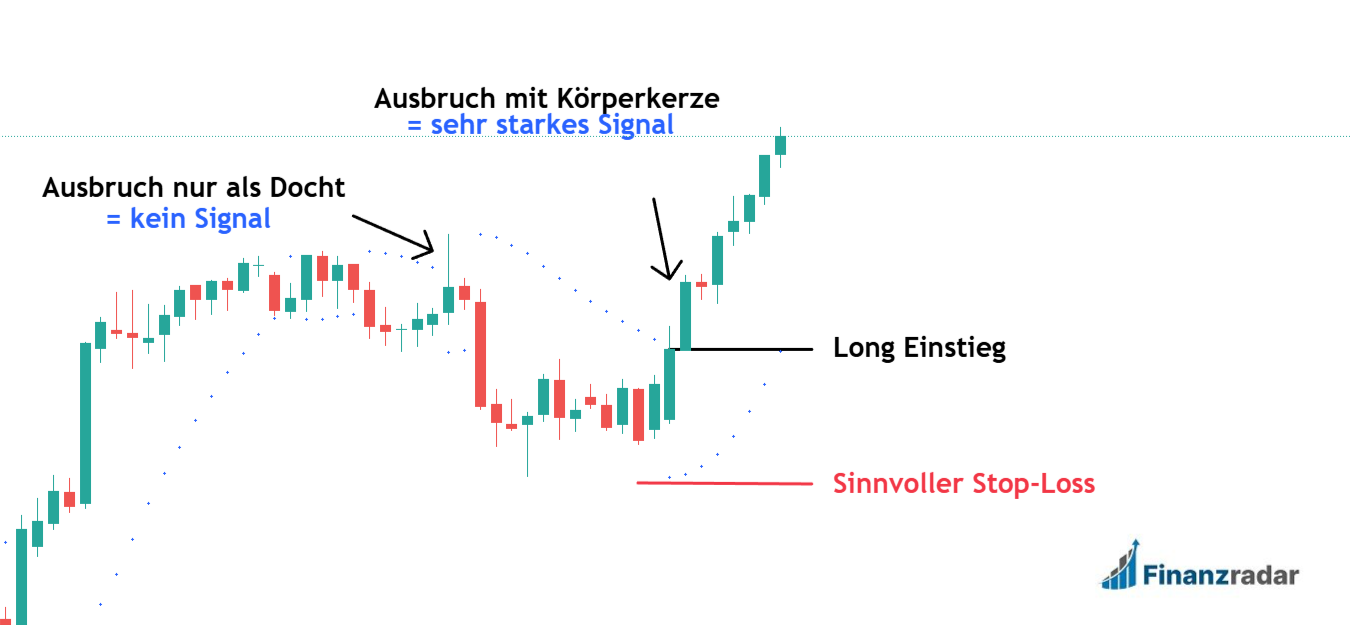 Kommt es zum starken Signal kannst Du eine Position mit sinnvollem Stop-Loss unter dem Parabolic SAR oder einem markanten Verlaufstief setzen.