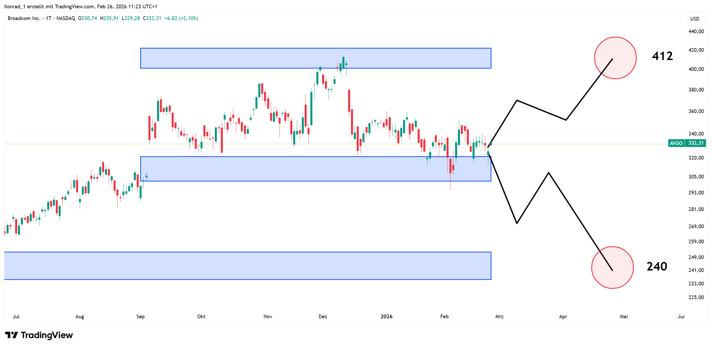 Für Broadcom sehe ich aktuell zwei Szenarien, das bullische Szenario bei 412 US-Dollar und das bearische bei 245 US-Dollar.