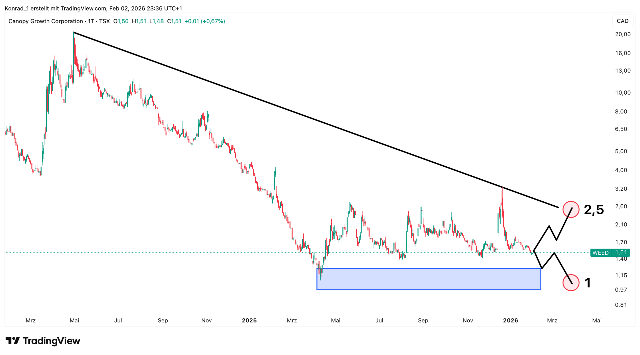 Für Canopy Growth gehe ich aktuell von zwei Szenarien aus, einem bullischen bei 2,5 CAD und einem bearischen bei 1 CAD.