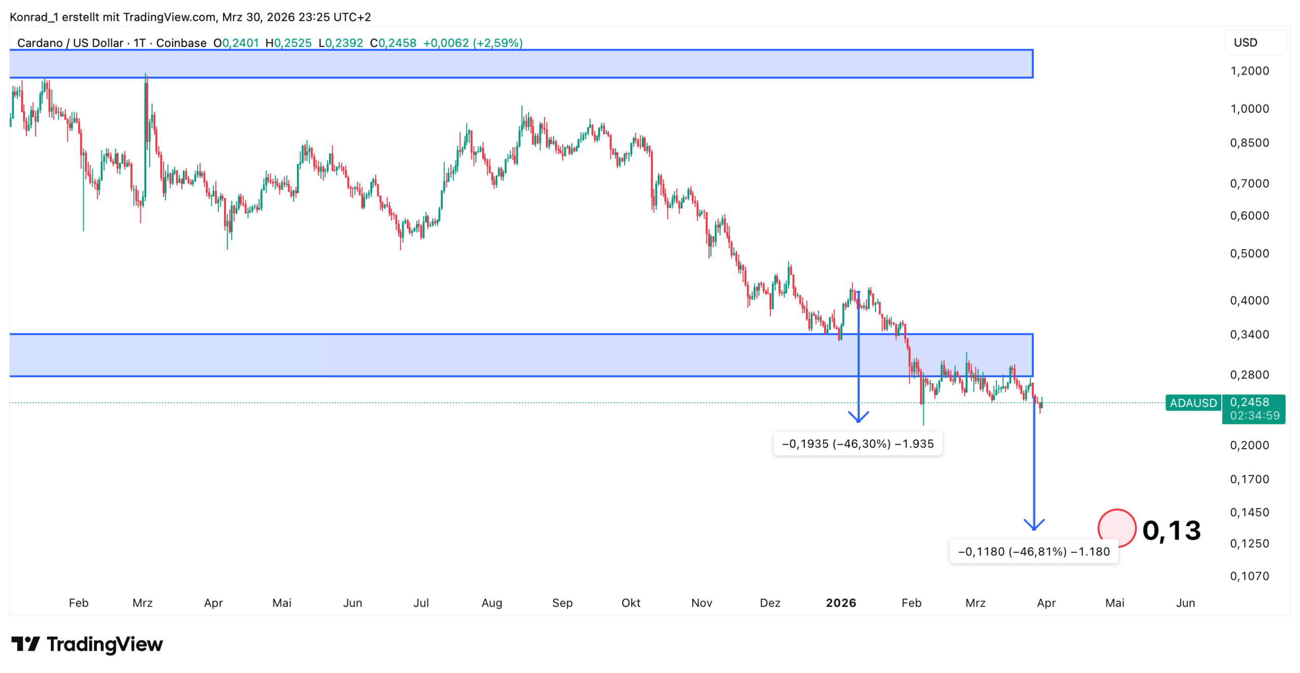 Für das Jahresende 2026 sehe ich Cardano bei einem Preis von 1,15 US-Dollar. Sollte Bitcoin als „Leitmarkt“ wieder steigen und einen weiteren Bullrun starten, würden auch andere Kryptowährungen wie Cardano davon profitieren.