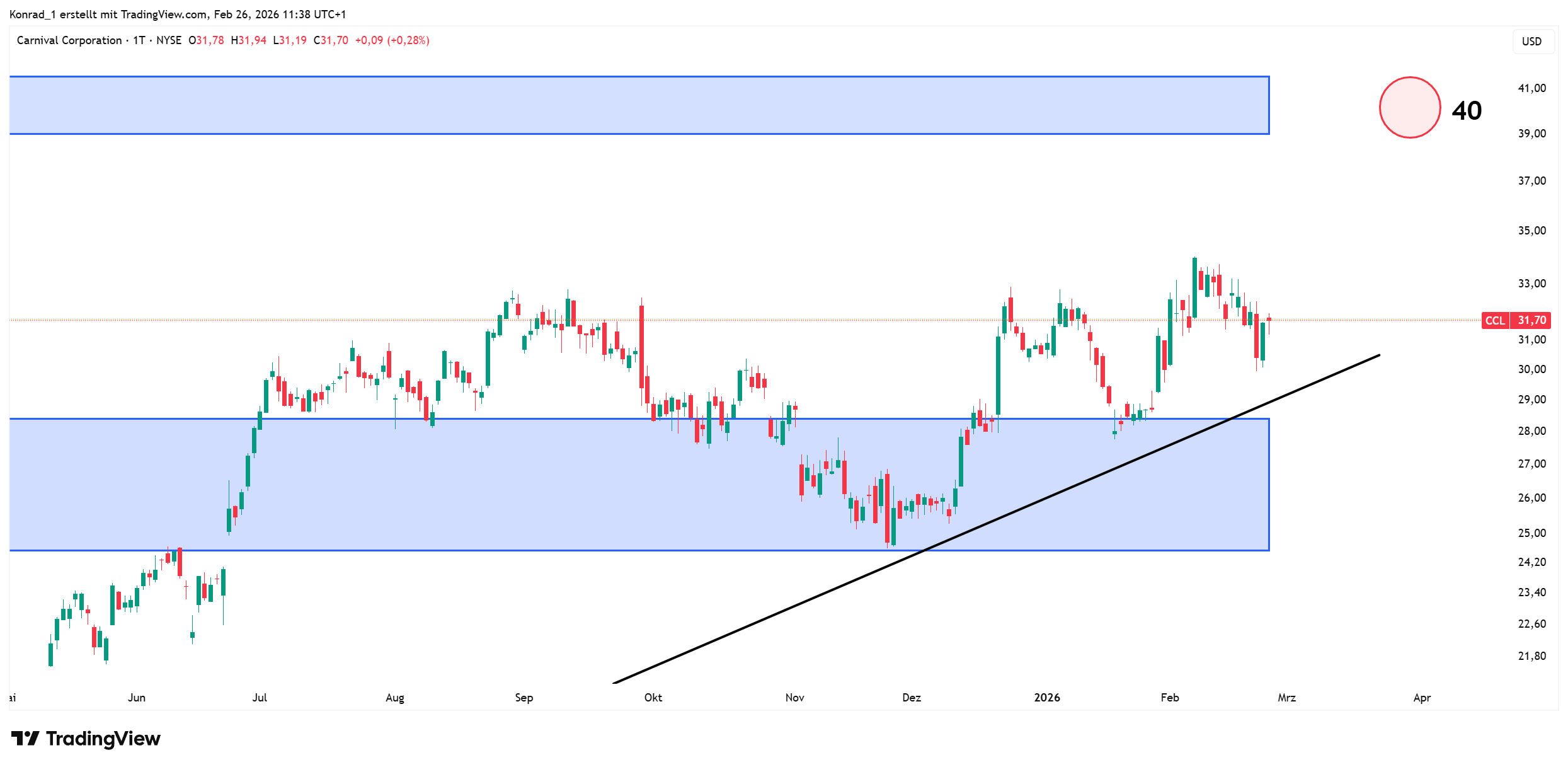 Für 2026 sehe ich für Carnival einen Preis von 40 US-Dollar als realistisch. Somit könnte die Aktie in Richtung der alten Allzeithochs laufen. Solange der Markt es schafft, sich über der Unterstützungszone zu halten, spricht das für meine Idee.