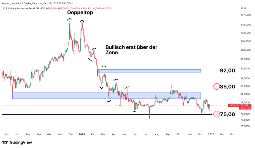 Bis Ende 2026 sehe ich den Kurs bei 106,00, sofern der 83,00-Bereich verteidigt wird. Der Wochenchart zeigt einen steigenden Trendkanal, der den Kurs mit nach oben begleiten kann. Sollten die Rohstoffpreise fallen oder sich Sanktionen verschärfen, wird der USD/RUB Kurs extra angetrieben.