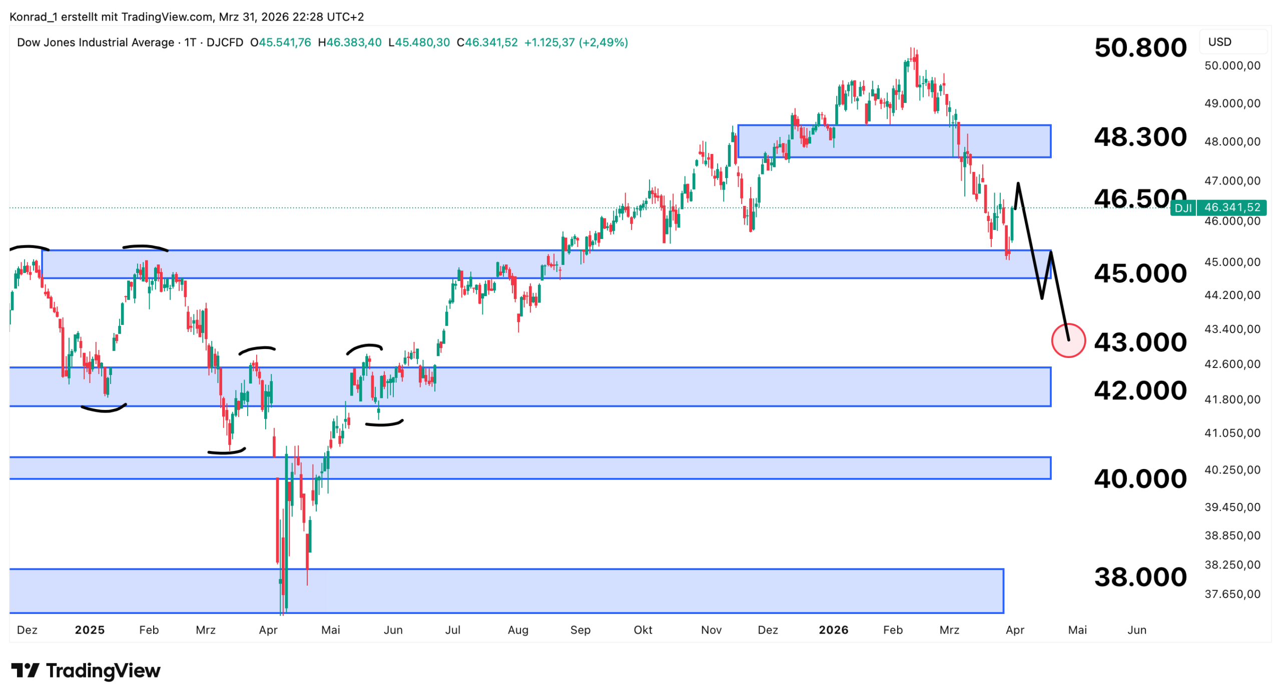 Der Dow Jones befindet sich aktuell an einer Unterstützungszone und aufgrund der vorherigen Schwäche gehe ich hier auch von einem weiteren Rücksetzer an die 43.000 aus.