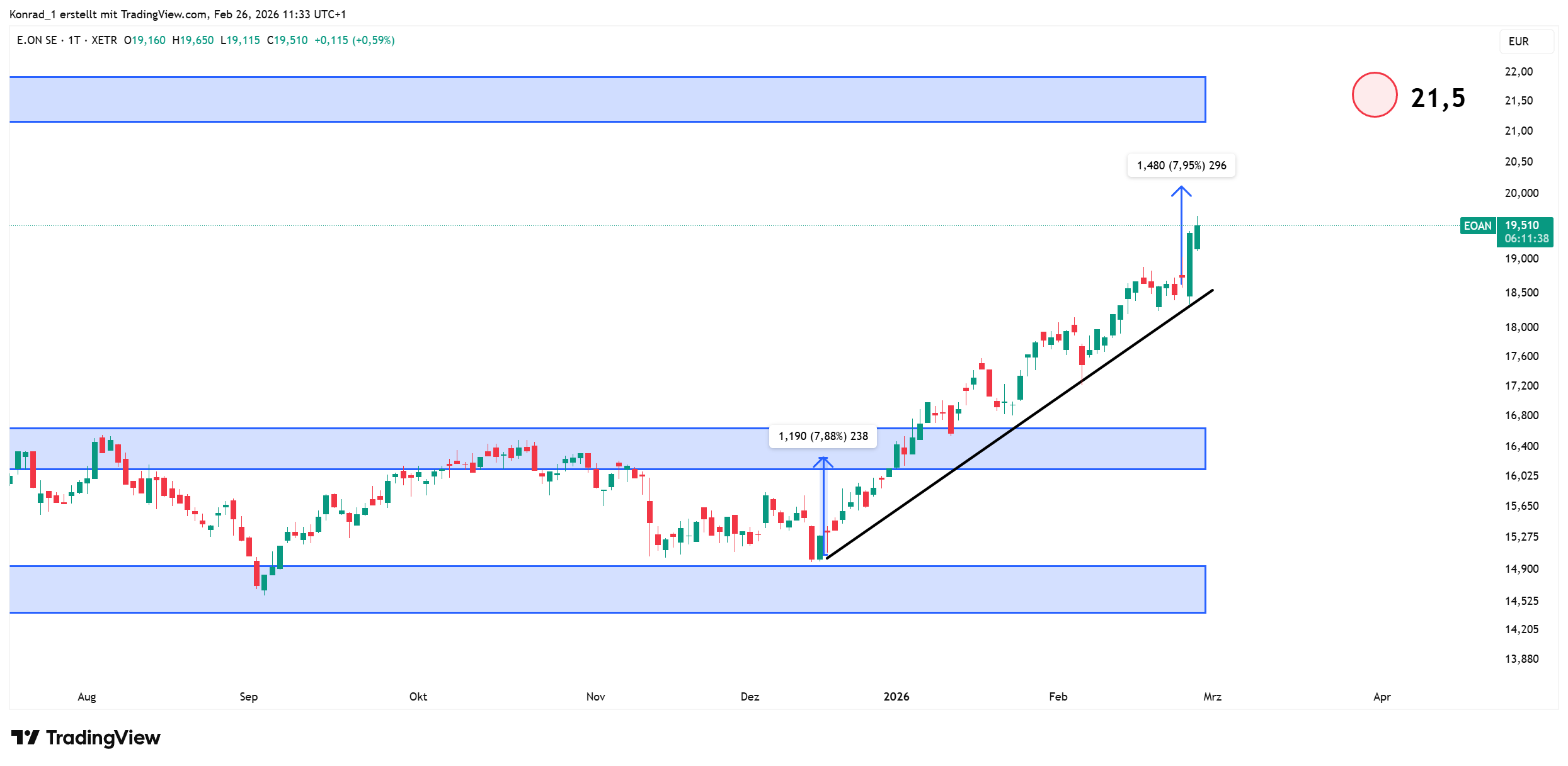 Die E.ON-Aktie zeigt aktuell deutliche Stärke. Ich gehe von einer Fortsetzung dieser Bewegung und dem Erreichen der 21,5 Euro aus.