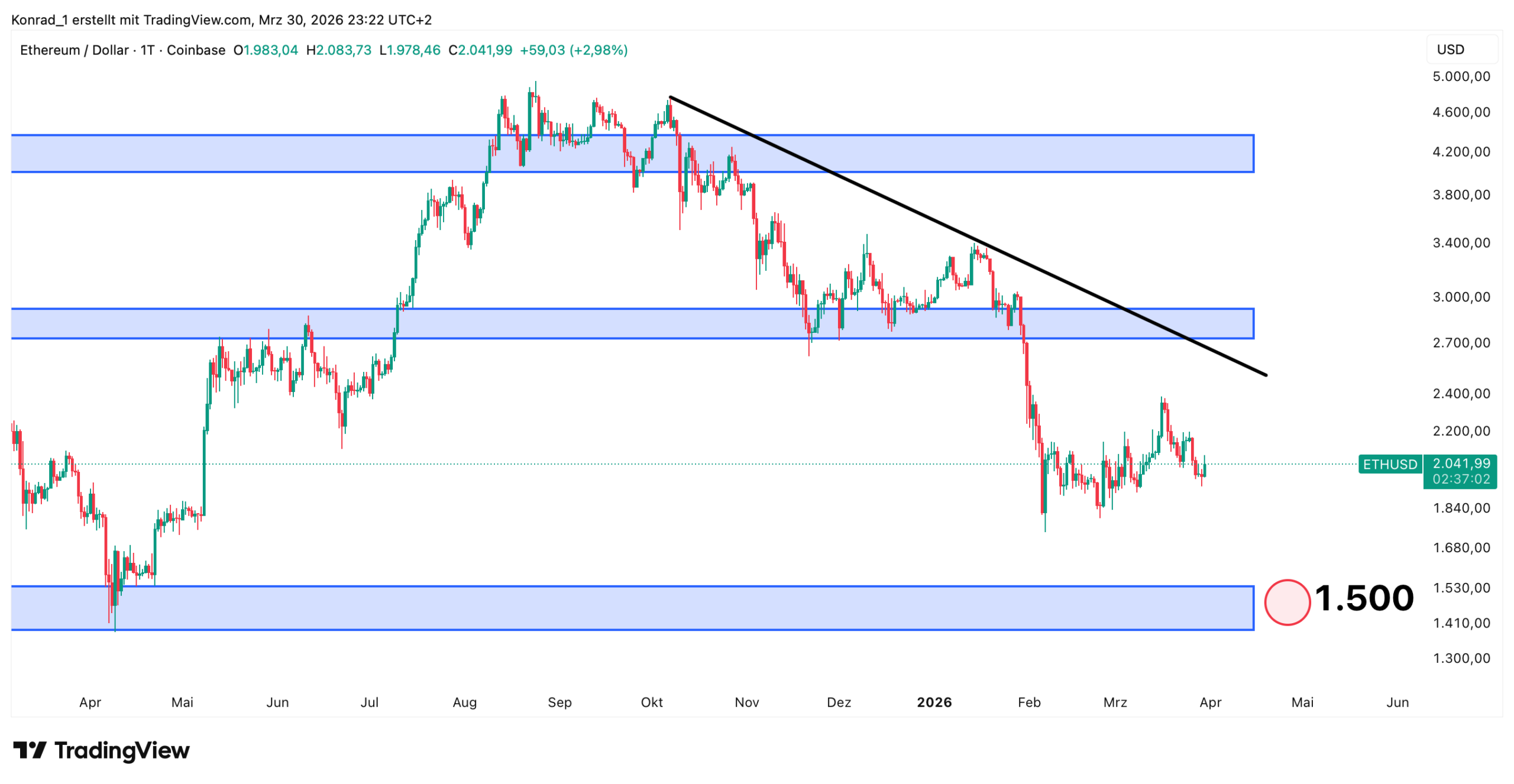 Ethereum hat die Unterstützungszone unterschritten. Ich gehe von weiter fallenden Kursen und dem Erreichen der 1.500-USD-Marke aus.