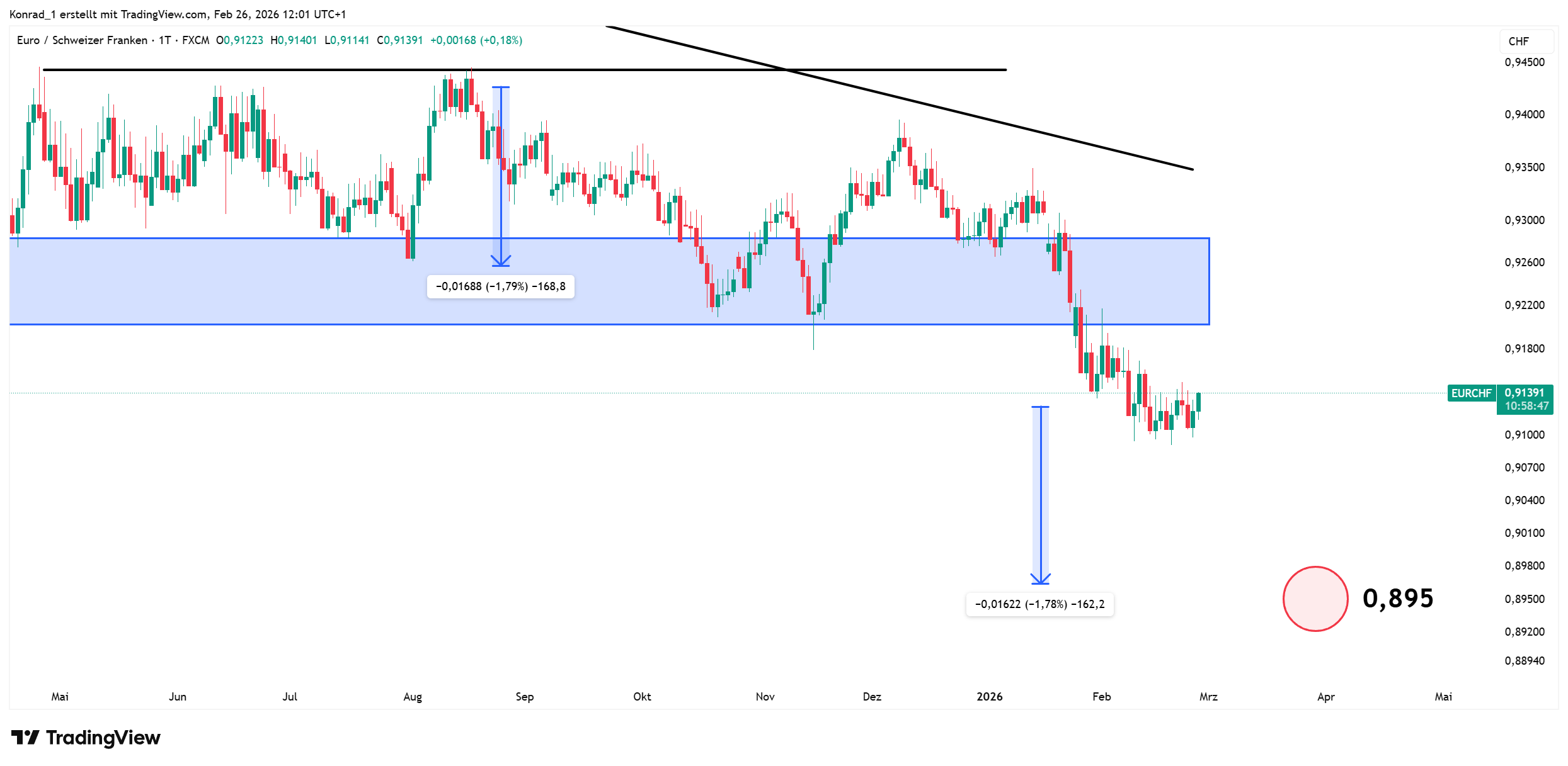 Der EUR/CHF hat die Seitwärtsbewegung nach unten verlassen. Ich gehe nun von einem Erreichen der 0,895 aus.
