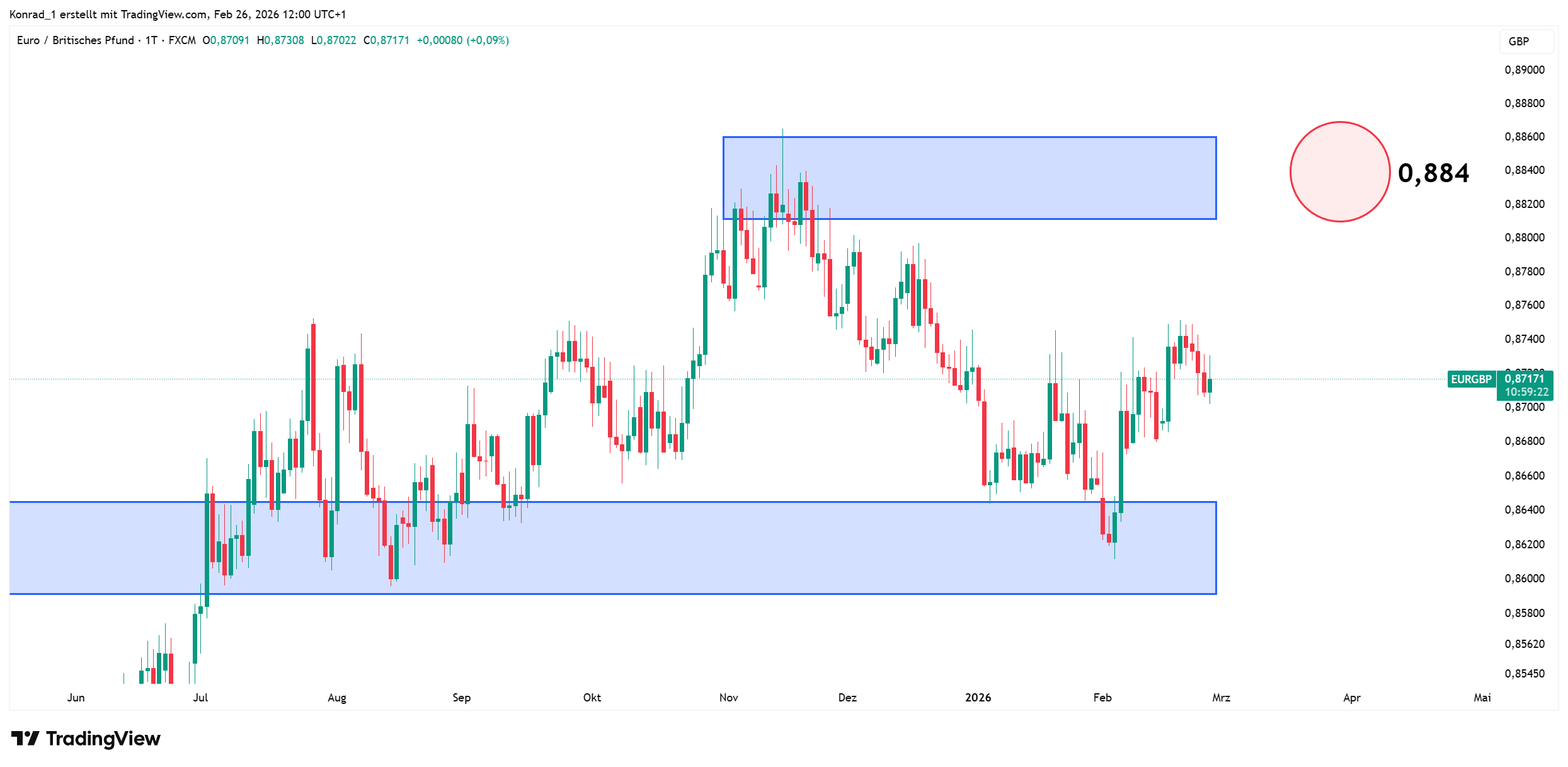 Bis Ende 2026 sehe ich den Kurs bei 0,915. Der EUR/GBP befindet sich in einem wieder in einer Aufwärtsstruktur, die sich mit hoher Wahrscheinlichkeit fortsetzen wird.