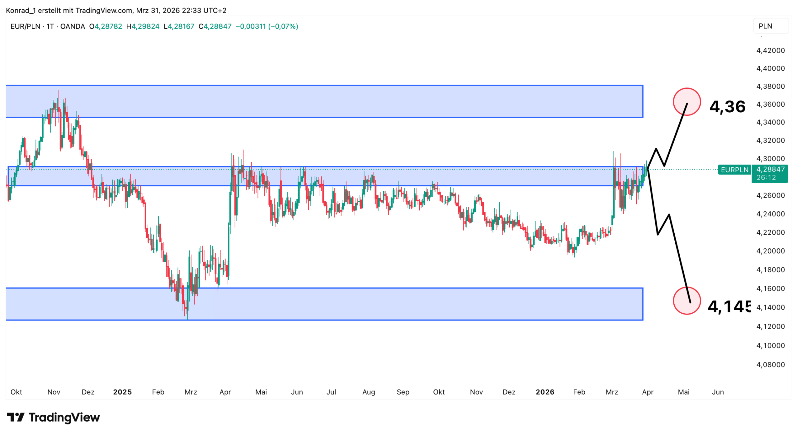 Der EUR/PLN-Kurs befindet sich an einer Zone und ich sehe hier aktuell zwei Szenarien: ein bullisches mit dem Ziel bei 4,36 und das bärische mit dem Ziel bei 4,145.