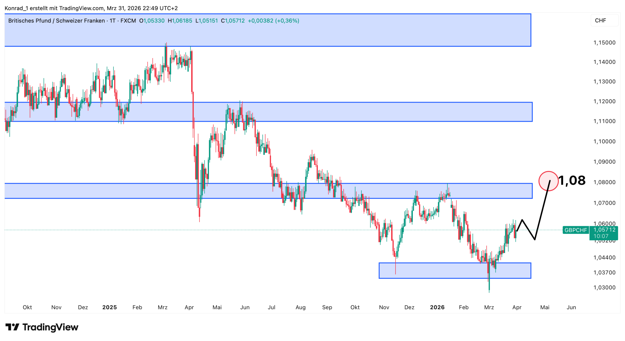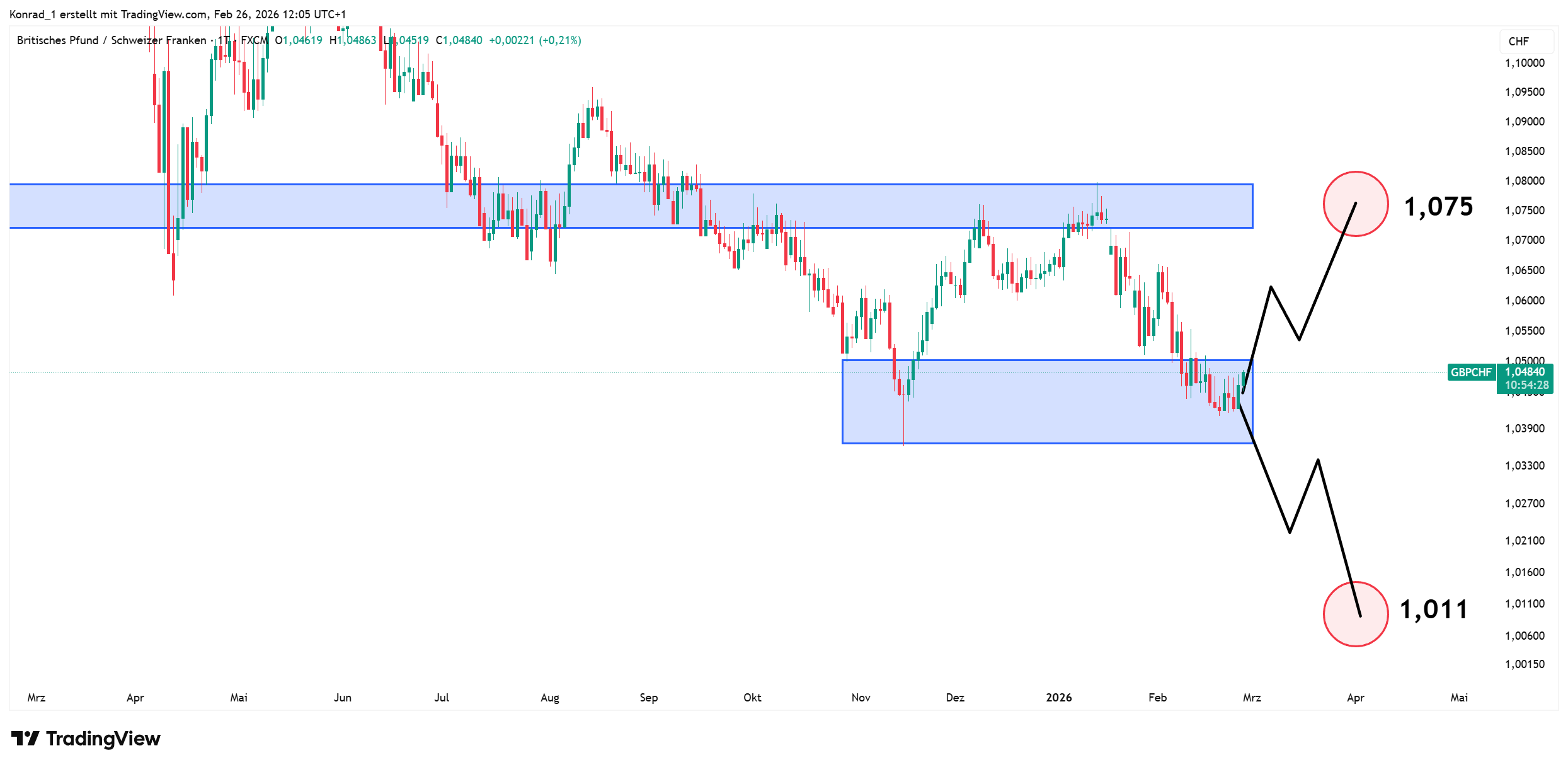 Für GBP/CHF sehe ich aktuell zwei Szenarien: ein bullisches mit dem Ziel bei 1,075 und ein bärisches mit dem Ziel bei 1,011.