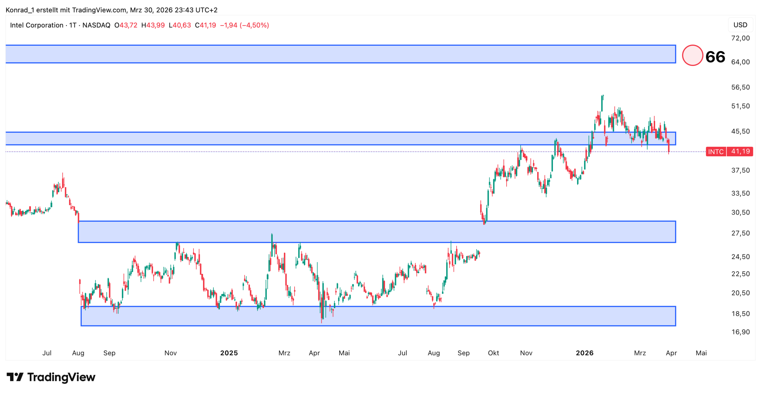 Intel befindet sich aktuell an einer Unterstützungszone. Ich gehe von weiter steigenden Kursen und dem Erreichen der 66 US-Dollar aus.