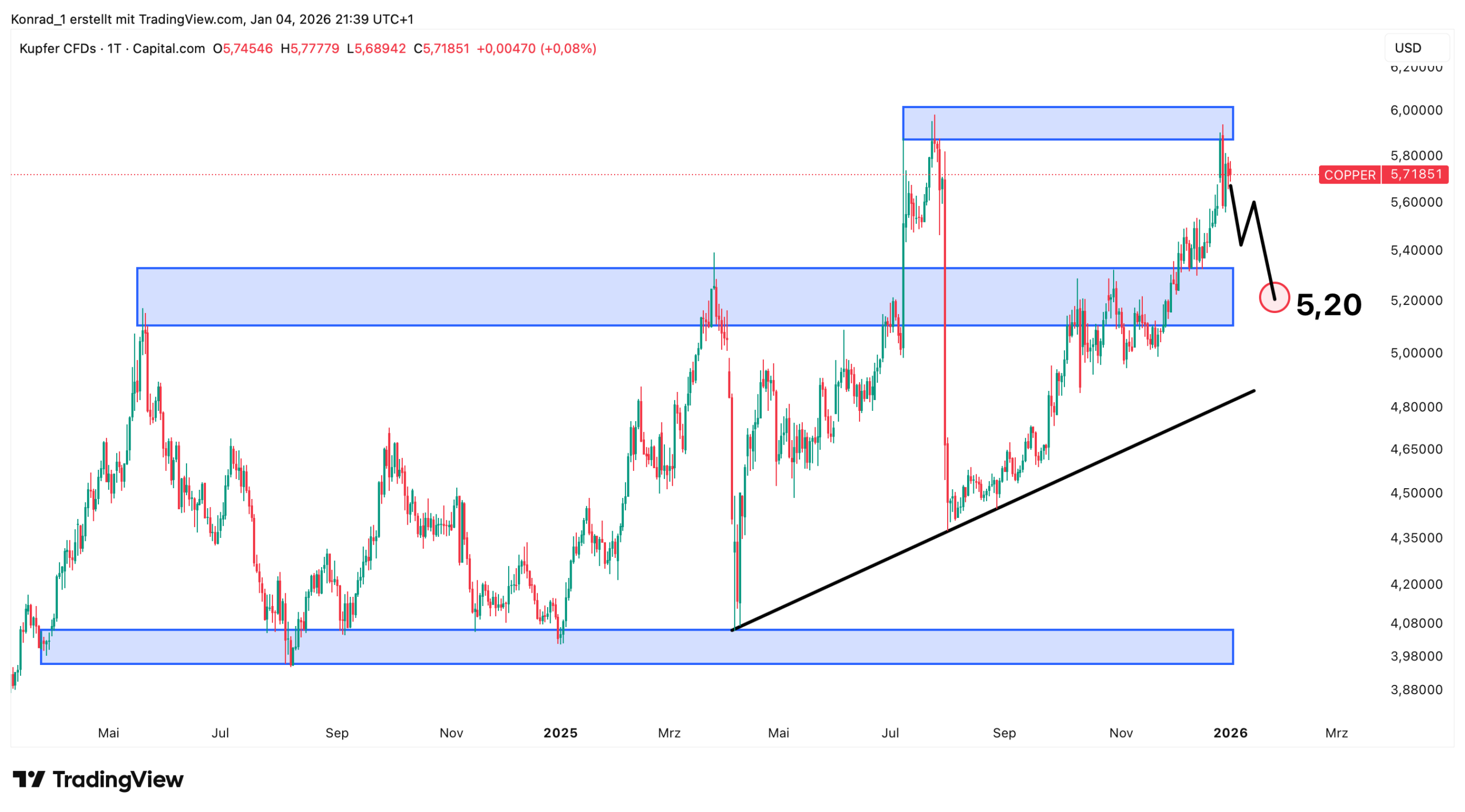 Beachte: Mit der 5 USD Marke hat der Kupferpreis eine starke Hürde zu überwinden. Zeichne Dir diesen Widerstand gerne im Chart selber ein. 🙂