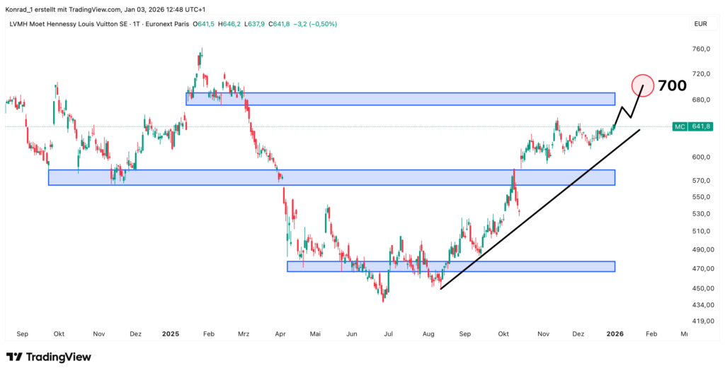 Bis 2026 sehe ich LVMH weiterhin bullisch und halte einen Kurs von 800 Euro für möglich. Die Zahl wohlhabender Menschen wächst, besonders in den USA und Asien. Dies könnte der Marke, die als Statussymbol gilt, weiteren Aufschwung verleihen und neue Stärke in die Aktie bringen.