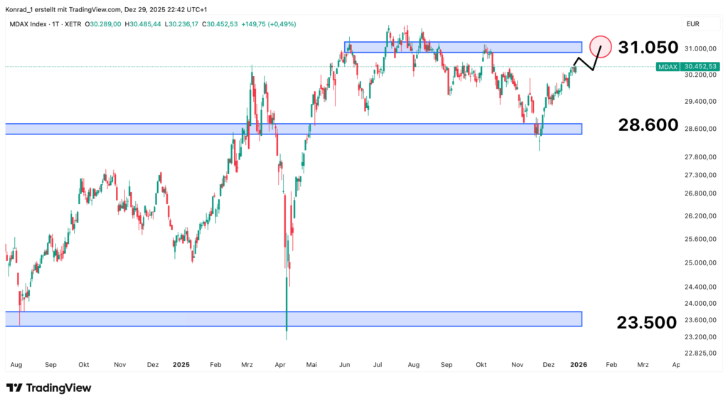 Der MDAX hat an der Unterstützungszone starke Kaufkraft gezeigt und ich gehe von weiterer Stärke sowie dem Erreichen der 31.050 aus.