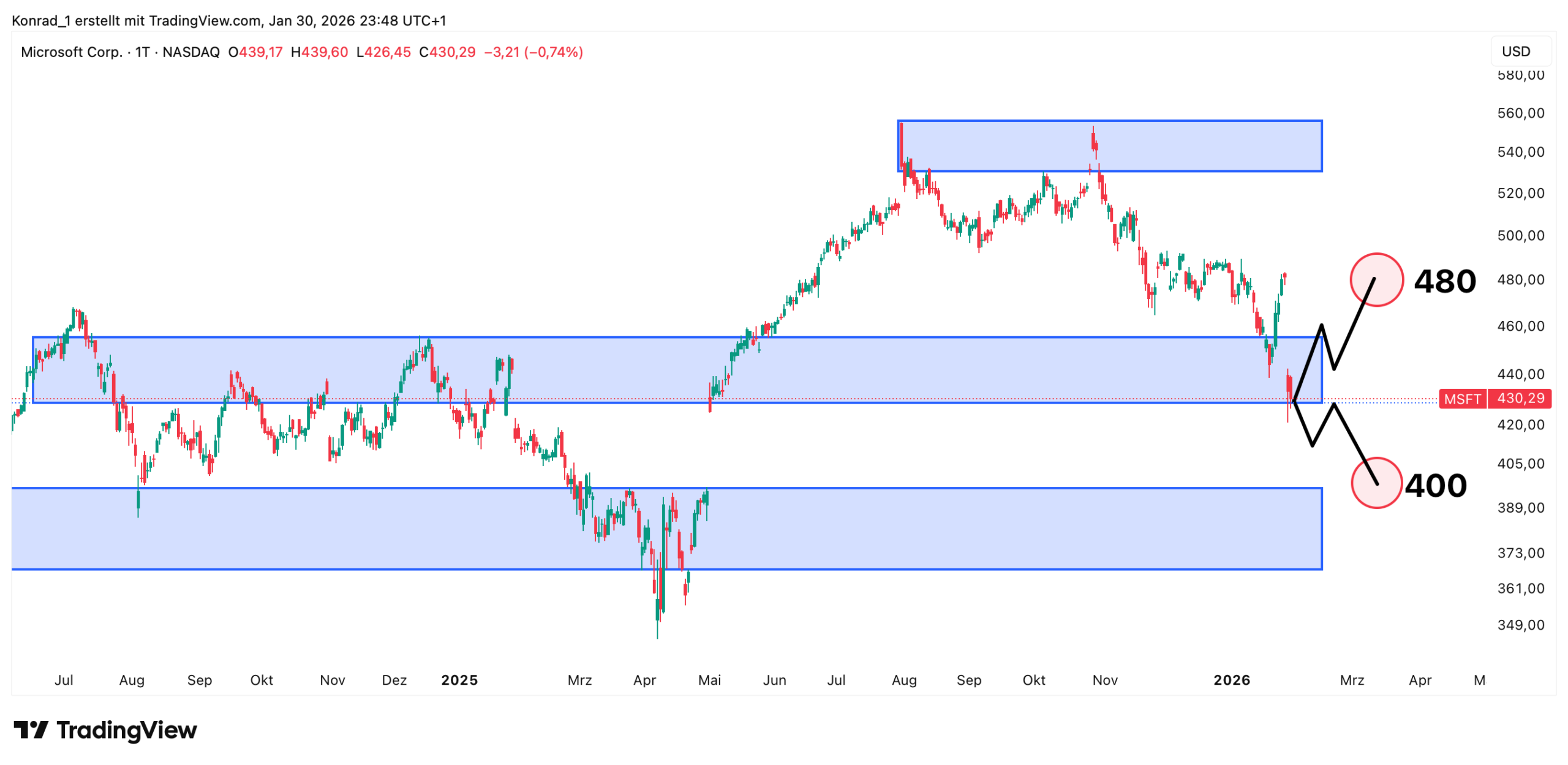 Microsoft befindet sich aktuell an einer Unterstützung und daraus ergeben sich zwei Szenarien, ein bullisches mit dem Ziel bei 480 US-Dollar und ein bearisches mit dem Ziel bei 400 US-Dollar.