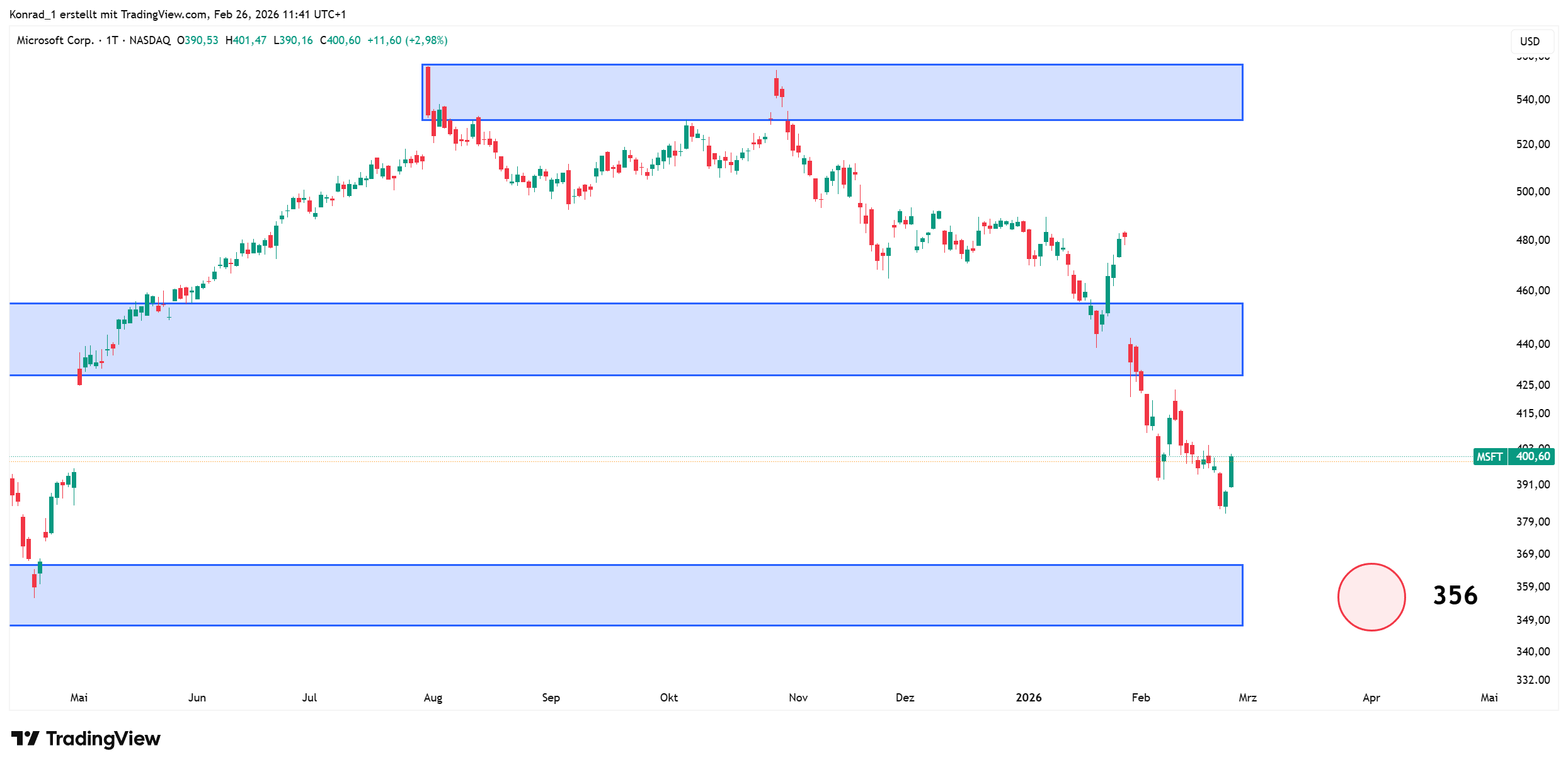 Microsoft hat die Unterstützungszone unterschritten. Ich gehe nun von weiterer Schwäche und dem Erreichen der 356 US-Dollar aus.