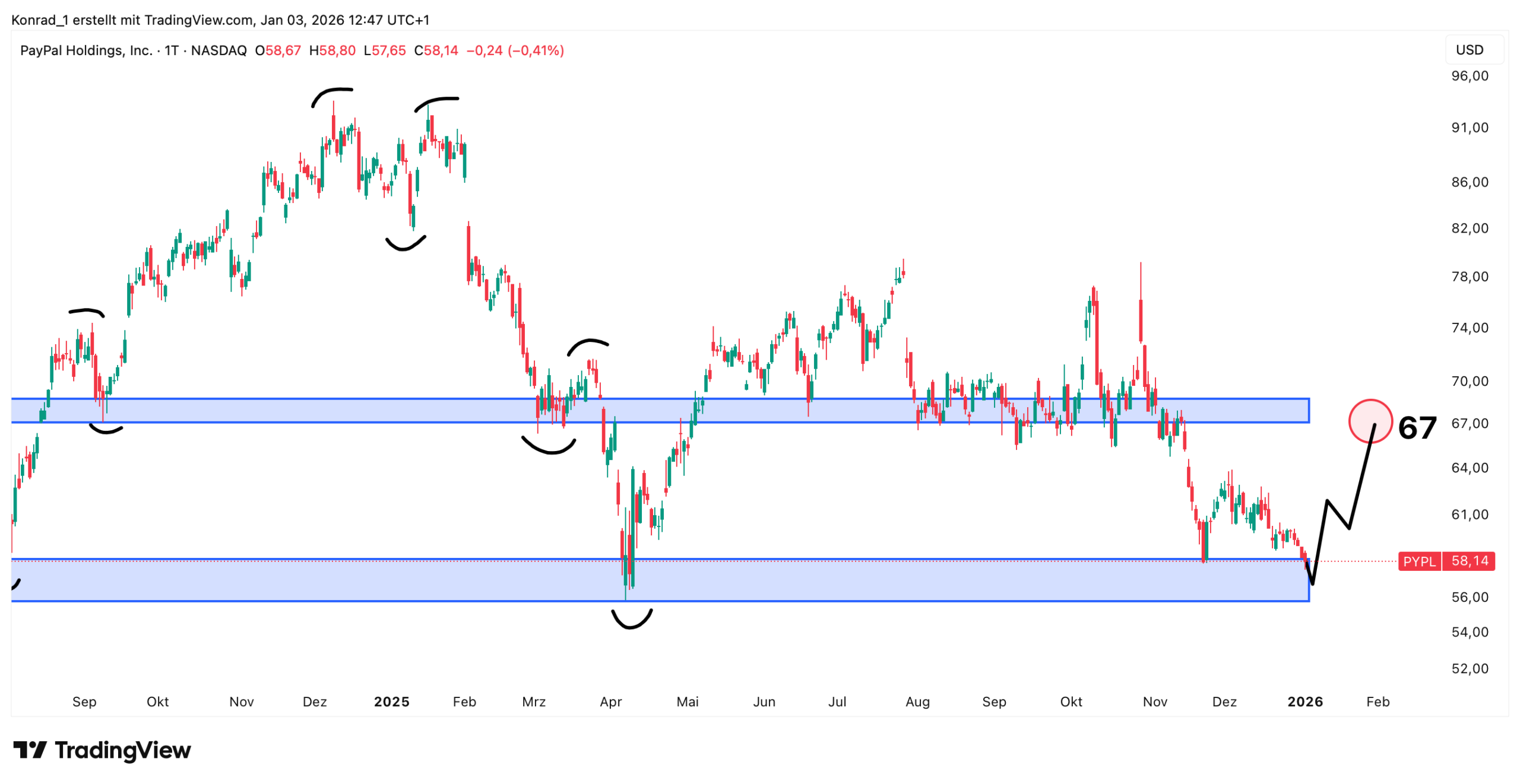 PayPal befindet sich aktuell an einer Unterstützungszone und ich gehe von weiter steigenden Kursen mit dem Ziel bei 67 US-Dollar aus.