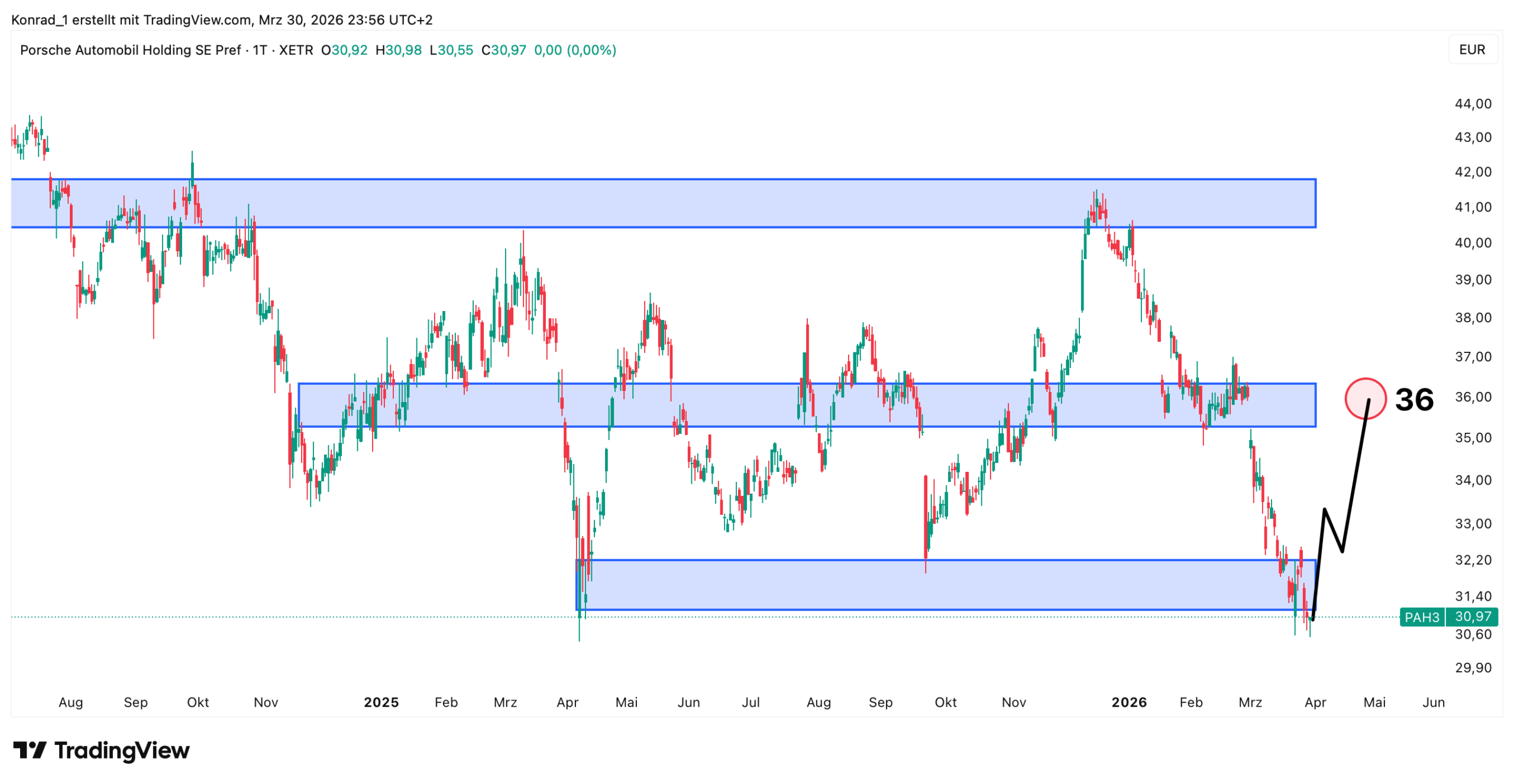 Die Porsche Holding befindet sich aktuell an einer Unterstützungszone und ich gehe hier von Kaufkraft mit dem Ziel bei 36 Euro aus.