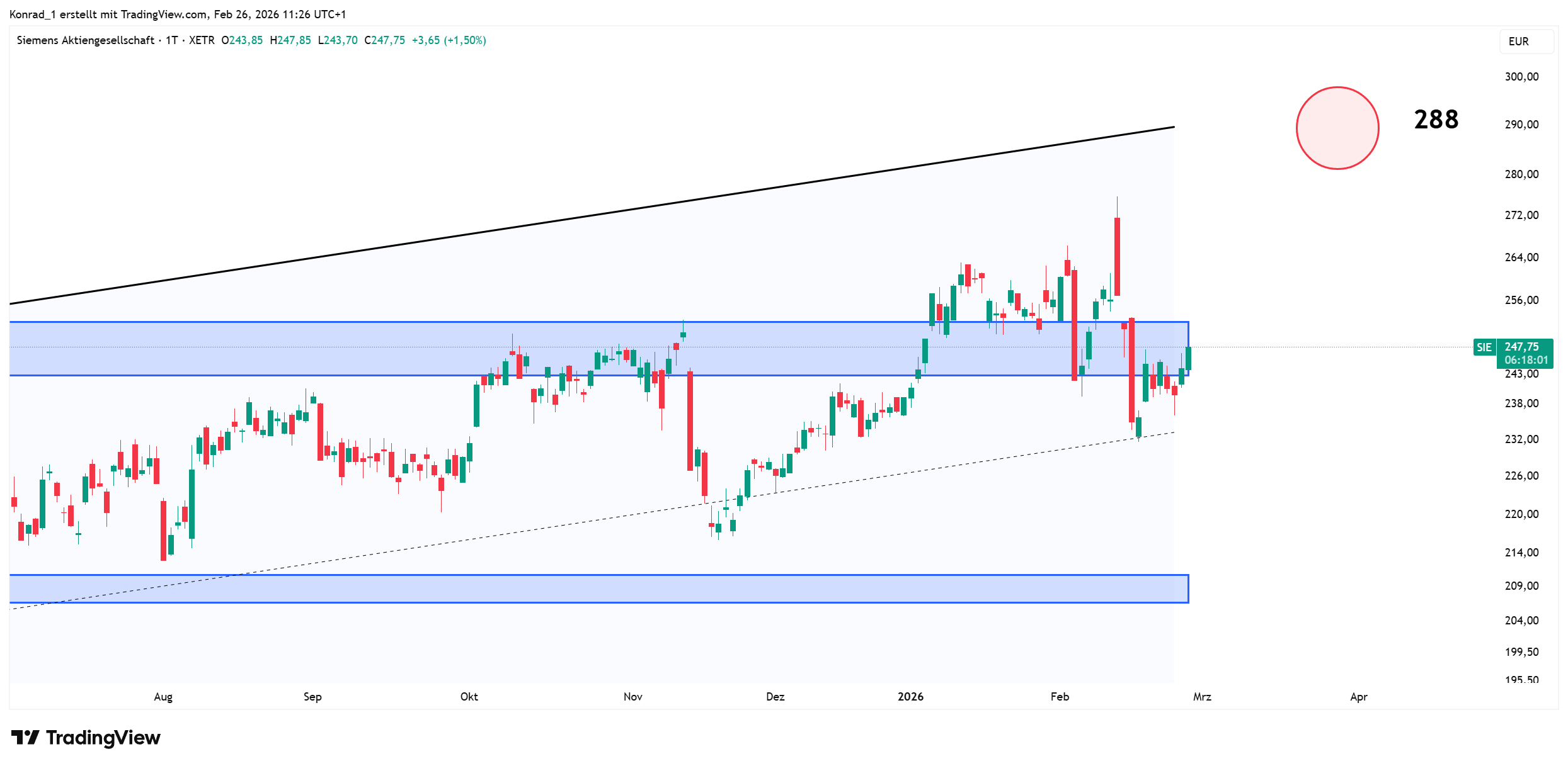 Für Siemens gehe ich nach dem starken Anstieg von weiter steigenden Kursen sowie dem Erreichen der 288 Euro aus.