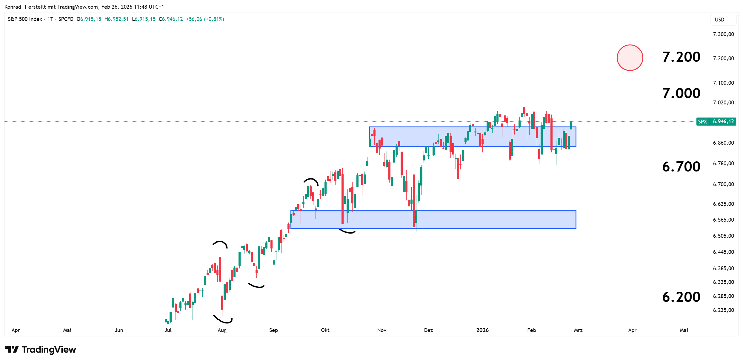 Am Ende von 2026 sehe ich den S&P500 im Bereich bei 7.800 Punkte. Da der SPX bereits seit 2022 im starken Trend ist, rechne ich mit weiteren steigenden Kursen. Die 7.000 stellt eine starke Psychologische Marke da, die der Markt überwinden muss.