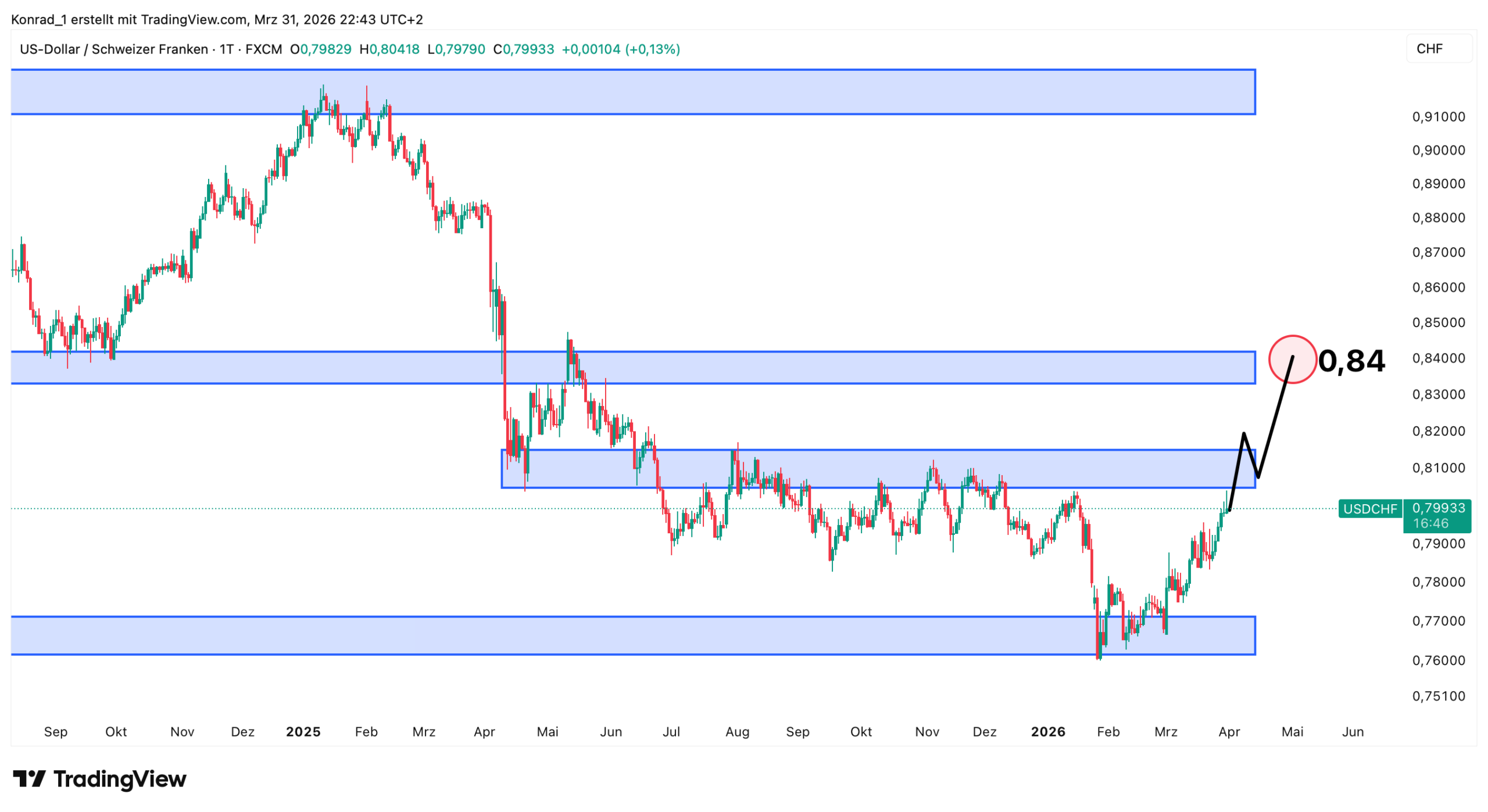Bis 2030 steht die Grundtendenz im USD/CHF erstmal auf Short mit einem Ziel bei 0,72. Sollte sich hingegen die US-Wirtschaft enorm stärken und die US Notenbank die Zinsen anheben könnte dies zu einer Stabiliserung führen. Kurs bei satten 1,03 sind dann auch eine mögliche Alternative.