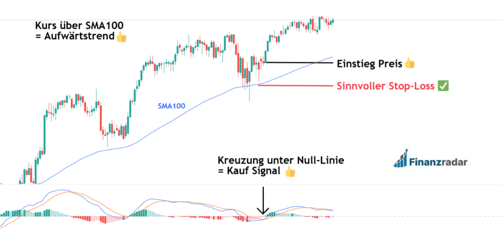 Beispiel: Der SMA100 dient zum Trendfilter. Im Chart oben liegt der Kurs drüber, weswegen ich ein Kauf Signal des Macd als Long Chance nutze. Das Verkauf Signal des Macd nutze ich später zum Schließen der Position.