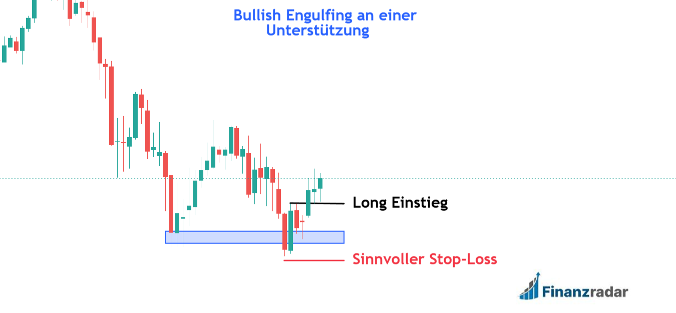 Bei Trade Eröffnung durch ein Engulfing kann man einen sinnvollen Stop-Loss knapp unter das Tief der beiden Kerzen setzen. Für ein bearish Engulfing gilt die umgekehrte Logik mit einem Stop-Loss knapp über dem Hoch der beiden Kerzen.