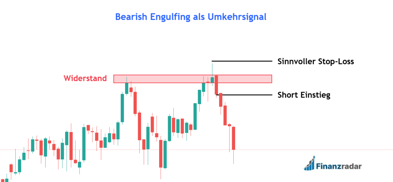 Das Bearish Engulfing lässt sich hervorragend für Short Einstiege, also das Setzen auf einen fallenden Kurs, nutzen! Bestenfalls achtet man aber nicht nur auf ein einzelnes Kerzenmuster, sondern kombiniert mehrere Charttechnik-Werkzeuge miteinander! So ist ein bearish Engulfing an einem Widerstand deutlich stärker als alleine!